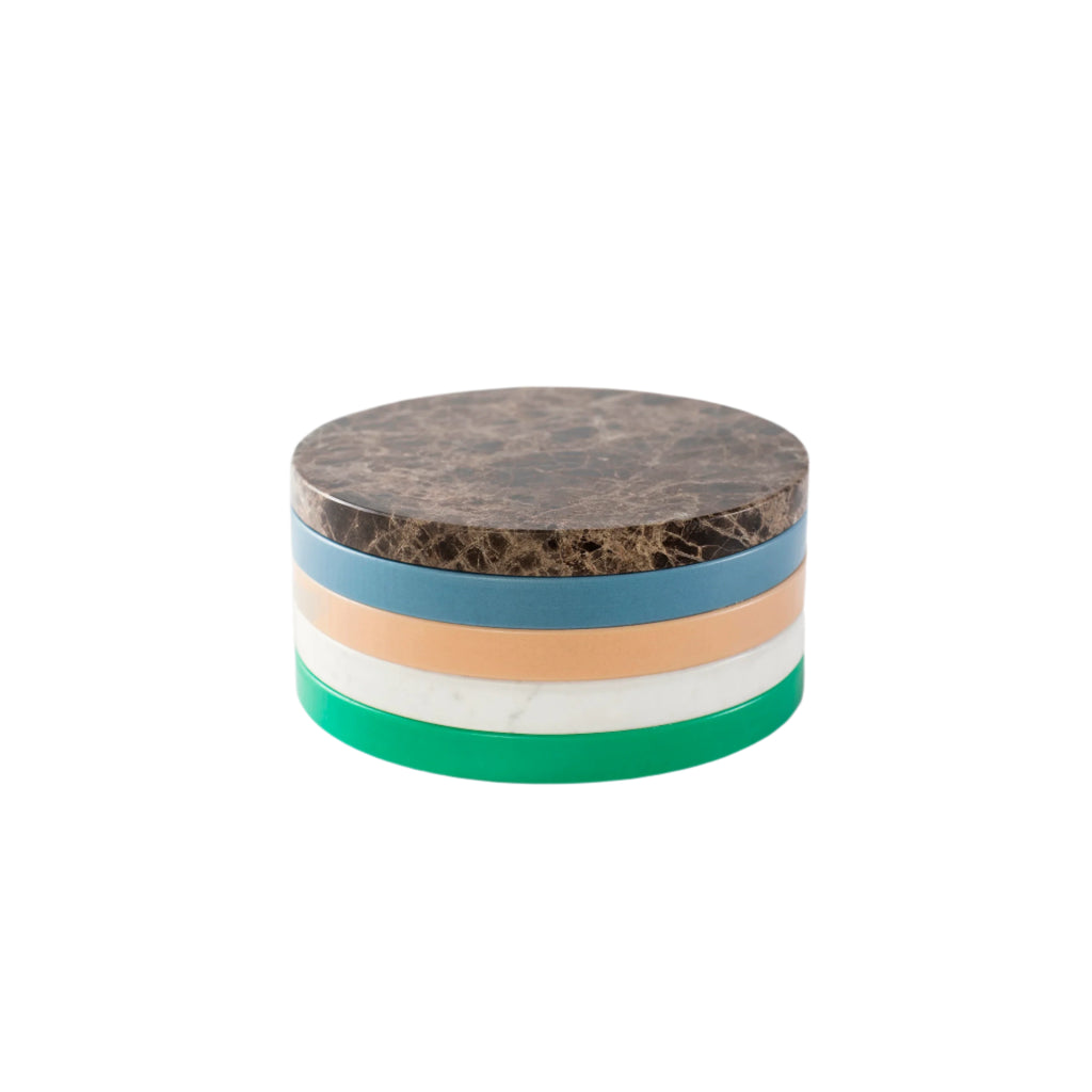 Muller Van Severen a creat mai multe variante de seturi de 5 platouri circulare pentru a fi folosite ca tavi pentru mancare. Five circles se compune din trei discuri de polietilena si doua din marmura. Cand sunt asezate unele peste altele, aceste discuri cu diametru de 21 cm si grosime de 2 cm, formeaza o sculptura colorata pe masa de dining. Ambalate intr-o frumoasa cutie de cadou cu un certificat semnat de designeri. Discurile de polietilena se pot spala la maxim 70° Celsius / 158° Fahrenheit. Toate discurile trebuie curatate manual.